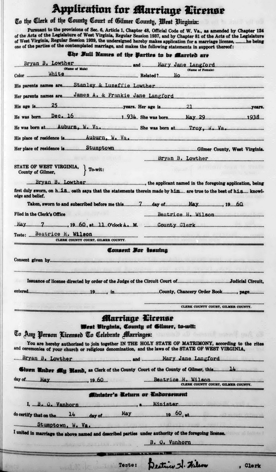 Wife: Mary Jane Langford Married: May-14-1960 at Stumptown, Gilmer Co, WV 4