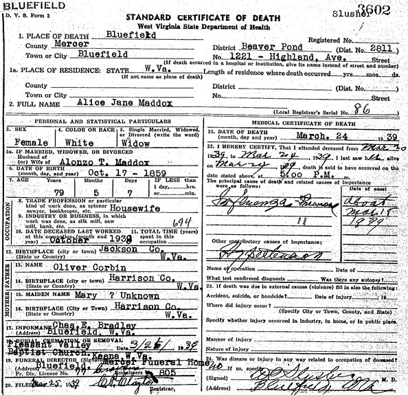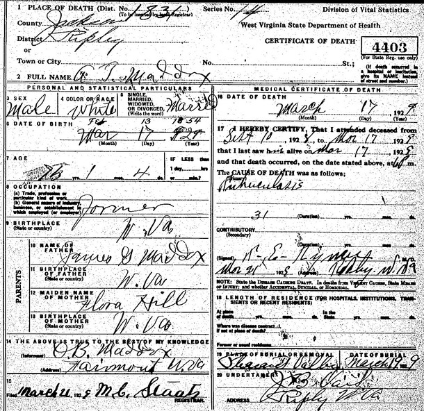 Sources: (1) WV State Dept of Health, Div of Vital Statistics, Death Certificate (http://www.wvculture.org/vrr/va_dcsearch.aspx) (2) Mrs. A. T. Maddox (Alice J. Corbin) in a report to A. M. Prichard and recorded in Allied Families of Read Corbin Luttrell Bywaters on page 168, as reported online at http://awt.ancestry.com by L. P. Kasper. (3) W. N. Hurley, Jr., Maddox: A Southern Maryland Family, Heritage Books, Bowie, MD, ISBN 0-788-0123-8, 1994. (4) 1900 Census, Jackson County, WV. (5) Death record of wife. (6) Death record of son. (7) Marion County Death Records, Fairmont, WV. (8) 1930 Census, Marion County, WV. (9) Jackson County Death Records, Ripley, WV. (10) 1910 Census, Jackson County, WV. (11) Mercer County Death Records, Princeton, WV. (12) Kanawha County Marriage Records, Charleston, WV. Name Index