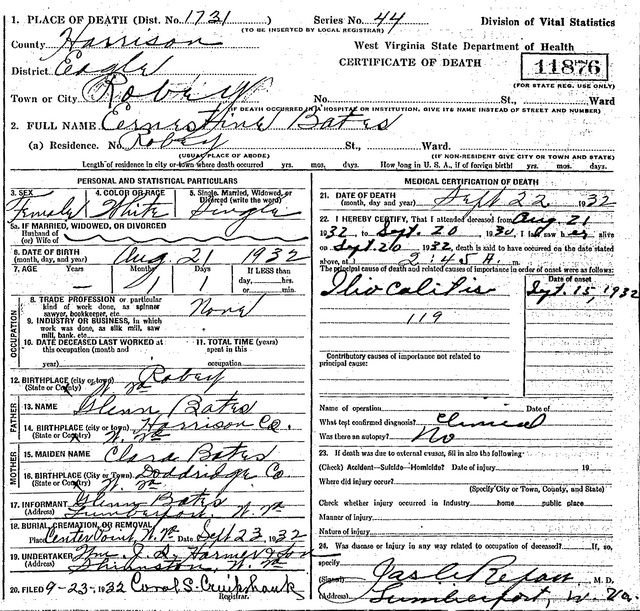F Child 10: Waveline Bates Born: Aug-21-1932 in Robey, Harrison Co, WV 26 Died: Sep-12-1932 in Robey, Harrison Co, WV 26 Buried: in Center Point Christian Church Cemetery, Doddridge Co, WV 26,25 Cause of death: malnutrition 26