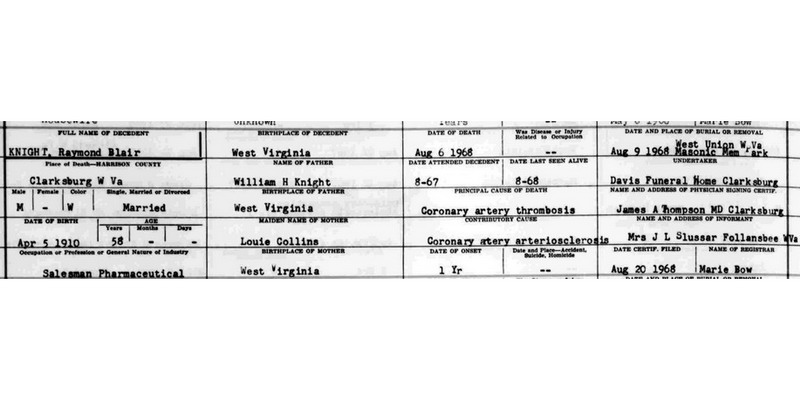 Jul-28-2018Husband: Raymond Blair Knight Also known as: Blair Knight 1,2 Born: Apr- 5-1910 in Blandville, Doddridge Co, WV 3,4,5,6 Died: Aug- 6-1968 in Clarksburg, Harrison Co, WV 6,4,5 Buried: in Masonic Memorial Park Cemetery, Crystal Lake (West Union), WV 5,6 Resided: 1932, 1956 in Clarksburg, Harrison Co, WV 7,2 Census: 1920 in Southwest District, Doddridge Co, WV Occupation: pharmaceutical sales 6 Father: William Henry Knight (1862 - 1937) Mother: Louie Rachel Collins (1876 - 1947)