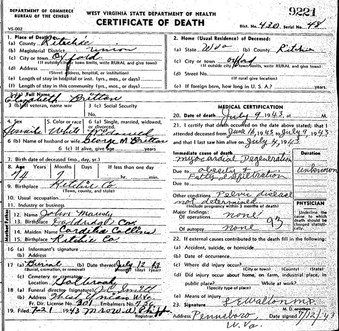 Sources: (1) Obituary of son. (2) Robert Junior (1926-2013) & Laurel Nutter (1924-2011) Britton, West Union, WV. (3) West Virginia Births Index, 1853-1969 [database on-line], Ancestry.com. (4) 1900 Census, Ritchie County, WV (Union District). (5) Headstone (year only) (6) Doddridge County Marriage Records, West Union, WV. (7) Obituary of wife. (8) Ritchie County Historical Society (David M. Scott, Editor), Ritchie County, West Virginia Cemeteries through 1993, McClain Printing Co, Parsons, WV, 1995. (9) Franklin Marion Brand, The Wade Family, Monongalia County, Virginia, now West Virginia (1927), p. 388. (10) Birth record of daughter. (11) Doddridge County Marriage Records, West Union, WV, Obituary of Elizabeth Maulsby Britton, West Union (WV) Record, 7/15/1943, gives marriage date Oct-6-1889, but Marriage Record states Oct-6-1892. MR Bk 3, p. 244. (12) Doddridge County WV Marriages 1845-1937, Wes Cochran, 156 Gihon Meadows, Apt 150, Parkersburg, WV 26101 (Jan 1993) (13) Obituary of Elizabeth Maulsby Britton, West Union (WV) Record, 7/15/1943, gives birthplace as Ritchie County, as does her Death Record. But Marriage Record states Doddridge Co, with ceremony performed in West Union at home of John Maulsby. Birthdate not given in death record, but age 74y 7m would put birth date at about Dec 1868. (14) Obituary. (15) Obituary of father. (16) Obituary of Elizabeth Maulsby Britton, West Union (WV) Record, 7/15/1943. (17) Obituary of brother. (18) 1920 Census, Ritchie County, WV (Union District). (19) Ritchie County Birth Records, Harrisville, WV. (20) Harrison County Death Records, Clarksburg, WV. (21) Social Security Death Index. (22) Headstone. (23) Ritchie County Marriage Records, Harrisville, WV, Identified as Lewis Howard Britton, 45, b. Ritchie Co, res. Oxford, son of G. M. & Elizabeth E.; and Lovie Virgel Stahl, divorced, 58, b. Lewis Co, res. Oxford, dau of Rezin & Thursie Hess. Married May 9 1939 in Cairo. MR p. 92. (24) Harrison County Marriage Records, Clarksburg, WV. (25) Ritchie County WV Marriages 1843-1915, Wes Cochran, 2515 10th Ave, Parkersburg WV 26101 (July 1985) (26) Obituary of daughter. (27) 1930 Census, Ritchie County, WV (Union District). (28) Marriage record of son. (29) Ritchie County Marriage Records, Harrisville, WV, Identified as Baxter M. Pierce, 22, b. Ritchie Co, res. Summers WVa; and Gracie Maud Britton, 19, b. Ritchie Co, res. Oxford WVa. Married Nov 9 1913 at Holbrook. MR p. 122. (30) Doddridge County Death Records, West Union, WV, DR Outside County Bk 1, p. 180. (31) Obituary - Hospital. (32) West Union WV Cemeteries (Doddridge County), Wes Cochran, 2515 10th Ave, Parkersburg, WV 26101 (July 1990) (33) Obituary of stepmother. (34) Susie Davis Nicholson, Davis - The Settlers of Salem, West Virginia, Gordon Printing Co, Strasburg OH, 1979 (Revised & Enlarged) < www.wvgenweb.org/harrison/books.htm >, p. 175. (35) Ritchie County WV Marriages 1916-1945, Wes Cochran, 2515 10th Ave, Parkersburg WV 26101 (Sep 1998) (36) National Archives and Records Administration, World War I Draft Registration Cards, 1917-1918 (Ancestry.com online database) (37) Obituary - Veterans Administration Hospital. (38) Findagrave.com. (39) Social Security Death Index, Social Security card issued in Pennsylvania before 1951. (40) Doddridge County Court House, West Union, WV, Marriage record gives groom's birthplace as Ritchie Co, with age of 21 as of Mar 5 1918. MR Bk 10, p 226. (41) 1920 Census, Doddridge County, WV (Southwest District). (42) Doddridge County Marriage Records, West Union, WV, Identified as J. Dewey Britton, 35, b. Ritchie Co, res. Oxford; and Mrs. Mayme Faulkner, 33, b. & res. in Doddridge Co. Married Dec 20 1933 in Clarksburg. Bk 13, p 140 http://www.wvculture.org/vrr/va_view.aspx?Id=11797154&Type=Marriage. (43) Social Security Death Index, Birth date listed as Oct 21 1900, but obituary has it as Oct 26 1900. (44) WV State Dept of Health, Div of Vital Statistics, Death Certificate (http://www.wvculture.org/vrr/va_dcsearch.aspx) (45) Death record of husband. (46) Obituary of husband. (47) 1920 Census, Ritchie County, WV (Berea District) (48) Descendants of Wilson Britton, Richard Lyle "Dickie" Britton (1941-2000) (self-published, 1992) (49) Newspaper announcement. (50) Ritchie County Birth Records, Harrisville, WV, Identified as "- - - Britton," white male, born alive on Oct 29 1906 at Holbrook, son of G. M. & Elizabeth E. Britton. Informant: J. C. Lawson, physician. BR p. 8. Event Notes Note (1) Birth date given in 1900 Census as Nov 1869, but obituary states Oct 17 1869, while headstone shows birth date as 1868. Note (2) But death record reports death date as Jul 9 1943, location Oxford, Ritchie County. Note (3) Listed as Eliza Maulsby, 11, a servant in the household of Benjamin & Charlotte (Collins) Smith. Note (4) Local news item, "Doddridge County Republican," Thursday, Apr 4 1918, in its entirety: "John D. Britton, a splendid Ritchie county young man, has accepted a position with the West Union Grocery company." Note (5) Obituary states birthdate as Oct 26 1900, but birth record shows it as Oct 21 1900, as does the Social Security Death Index. Name listed in SSDI as "O. Britton."Name Index