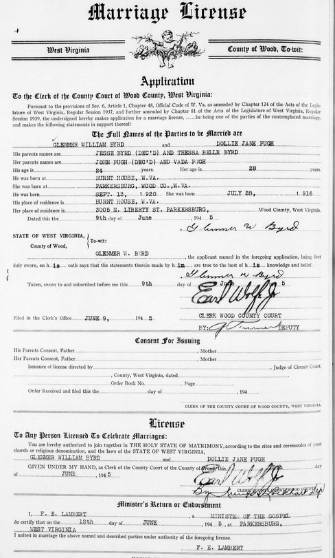 Jul-28-2018Husband: Glenmer William "Dude" Byrd Born: Sep-13-1920 at Burnt House, Ritchie Co, WV 1,2 Died: Mar- 1-1998 2 Resided: in Smithville, Ritchie Co, WV 3 Resided: 1945 in Burnt House, Ritchie Co, WV 1 Father: Jesse Lane Byrd (1893 - 1934) Mother: Thessa Belle Gragg (1897 - 1977)