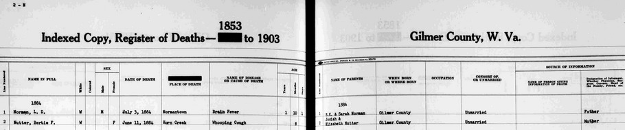 F Child 6: Bertie Ford Nutter Born: Oct- -1883 at Stone Lick, Horn Creek, Coxs Mills, Gilmer Co, WV 18 Died: Jun-11-1884 at Stone Lick, Horn Creek, Coxs Mills, Gilmer Co, WV 19 Cause of death: whooping cough 20