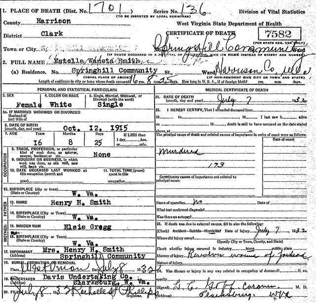 F Child 1: Estella Waneta Smith Also known as: Waneta Smith 10 Born: Oct-12-1915 2 Died: Jul- 7-1932 in Clark District, Harrison Co, WV 2 Buried: in Freeman Cemetery, Piggin Run, West Union, Doddridge Co, WV 4 Cause of death: revolver wound of forehead (homicide) 4