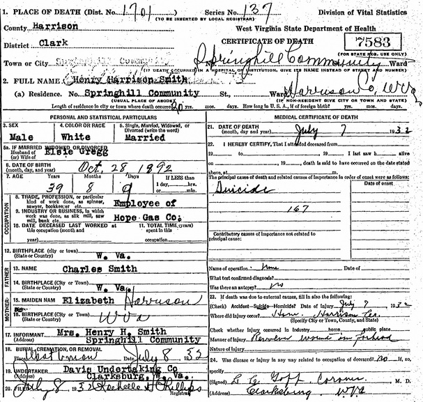 Jul-28-2018Husband: Henry Harrison Smith Also known as: Harry H. Smith 1 Born: Oct-28-1892 in Barbour Co, WV 2,1 (see note 1) Died: Jul- 7-1932 in Clark District, Harrison Co, WV 2,3 Buried: in Freeman Cemetery, Piggin Run, West Union, Doddridge Co, WV 4 Cause of death: suicide by revolver 2 Resided: 1914 in Doddridge Co, WV 1 Census: 1900 in Southwest District, Doddridge Co, WV Occupation: Hope Gas Co. 2 Father: Charles Allen Smith (1846 - 1926) Mother: Elizabeth Huber (1852 - 1940)