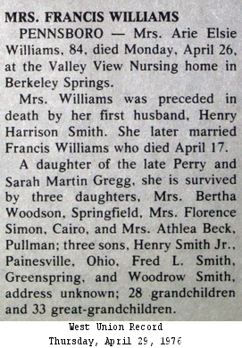 Sources: (1) Doddridge County Marriage Records, West Union, WV. (2) WV State Dept of Health, Div of Vital Statistics, Death Certificate (http://www.wvculture.org/vrr/va_dcsearch.aspx) (3) Headstone (year only) (4) Findagrave.com. (5) Obituary of daughter. (6) Marriage record of son. (7) Doddridge County Marriage Records, West Union, WV, Identified as Harry H. Smith, 23, b. Barbour Co, res. Doddridge Co; and Elsie A. Gregg, 23, b. Ritchie Co, res. Doddridge Co. Married Dec 26 1914 "at Home of Coy Greggs.", MR p. 359. (8) Social Security Death Index. (9) Obituary - Nursing home. (10) Headstone. (11) One World Tree (www.ancestry.com) (12) Ritchie County Marriage Records, Harrisville, WV. (13) Marriage record of daughter. (14) Obituary of sister. (15) Obituary of husband. (16) 1940 Census, Ritchie County, WV. (17) Social Security Death Index, Social Security card issued in West Virginia before 1951. (18) Obituary. Event Notes Note (1) Birth date on headstone is 1893. Note (2) Birth date given in 1900 Census as Jun 1891, but SSDI shows it as May 29 1892.Name Index