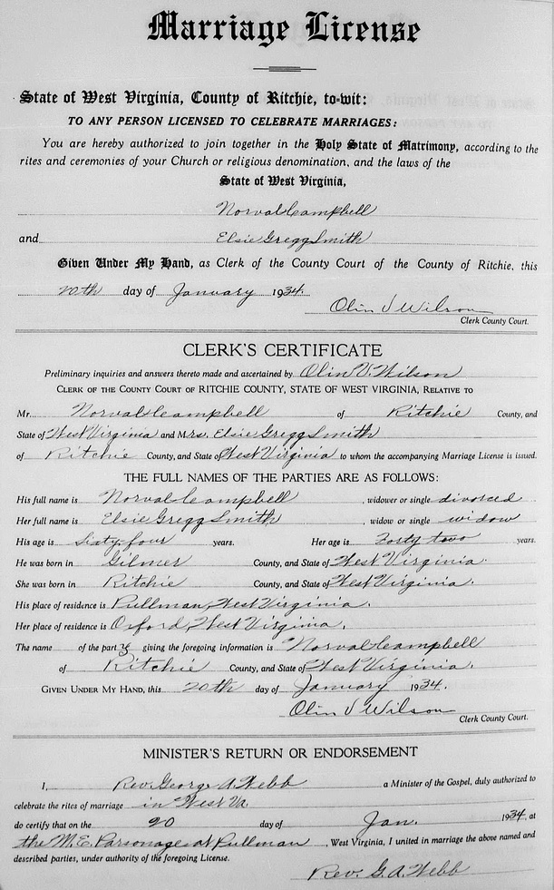 Jul-28-2018Husband: Norval B. Campbell Born: Mar-23-1869 in Gilmer Co, WV 1,2 Died: Oct-25-1939 in Pullman, Ritchie Co, WV 1 Buried: in Pritchard Cem, across SFHR from mouth of White Oak Crk, Ritchie Co, WV 3,1 Resided: in Pullman, Ritchie Co, WV 2,1 Occupation: farmer 1 Father: Perry Campbell Mother: Emma Luzader