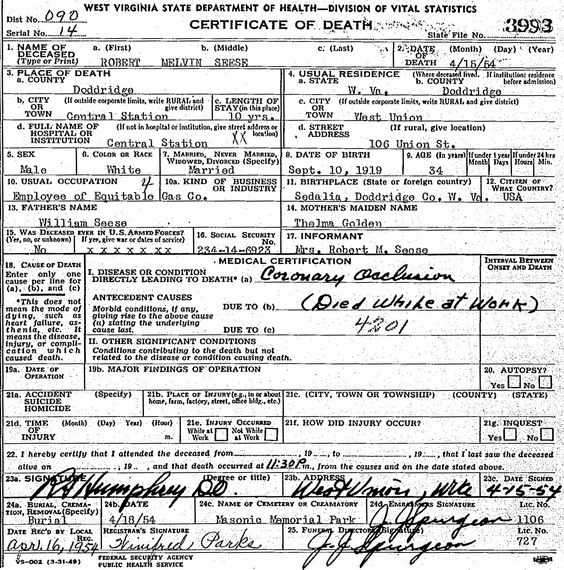 Jul-28-2018Husband: Robert Melvin Seese Born: Sep-16-1919 at Sedalia, Doddridge Co, WV 1,2 Died: Apr-15-1954 at Central Station, Doddridge Co, WV 1,2 Buried: in Masonic Memorial Park Cemetery, Crystal Lake (West Union), WV 1,3 Resided: in West Union, Doddridge Co, WV 4,1 Census: 1940 - Elkhorn Rd in McClellan District, Doddridge Co, WV Census: 1930 in Central Station, Doddridge Co, WV Occupation: Equitable Gas Co. 1 Father: Willis S. Seese (1899 - 1978) Mother: Thelma M. Golden (1905 - 1996)