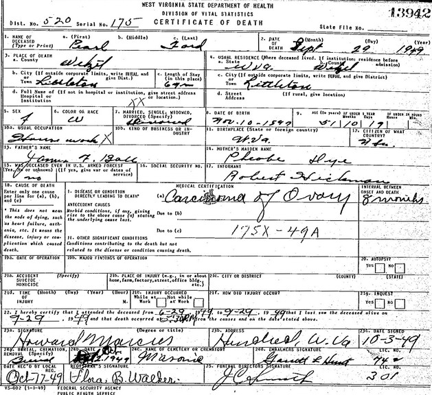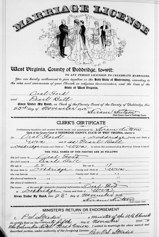 Sources: (1) Susie Davis Nicholson, Davis - The Settlers of Salem, West Virginia, Gordon Printing Co, Strasburg OH, 1979 (Revised & Enlarged) < www.wvgenweb.org/harrison/books.htm >, p. 218. (2) Social Security Death Index. (3) Doddridge County Marriage Records, West Union, WV. (4) Barbour County Death Records, Philippi, WV. (5) Social Security Death Index, Social Security card issued in West Virginia before 1951. (6) 1930 Census, Harrison County, WV. (7) 1920 Census, Harrison County, WV. (8) Death record of daughter. (9) Doddridge County Marriage Records, West Union, WV, Identified as Oral Ford, 22, b. & res. in Doddridge Co; and Pearl Ball, 17, b. & res. in Doddridge Co. Married Nov 25 1915 "at The Columbia Hotel, West Union," officiated by P. S. Strader, a Minister of the U.B. Church. MR p. 454 : www.wvculture.org/vrr/va_view.aspx?Id=11795150&Type=Marriage. (10) Newspaper wedding announcement, "West Union Record," Thursday, Dec 2 1915, in its entirety: FORD - BALL Miss Pearl Ball and Orval Ford of near Salem were married here at the Columbian hotel Thursday evening about 5 o'clock. Rev. P. S. Strader officiated. The ceremony was witnessed by J. A. Finley and Miss Ford, as sister of the groom. (11) West Virginia Births Index, 1853-1969 [database on-line], Ancestry.com. (12) 1900 Census, Doddridge County, WV (Grant District) (13) WV State Dept of Health, Div of Vital Statistics, Death Certificate (http://www.wvculture.org/vrr/va_dcsearch.aspx) (14) Hancock County Marriage Records, New Cumberland, WV. (15) 1940 Census, Doddridge County, WV (New Milton District) Event Notes Note (1) Birth date given in death record as Nov 10 1897. But the 1900 Census shows it as Nov 1898, age 1, and her birth record states Nov 10 1898. Other than her birth record and that 1900 Census, in which she was listed as Nina P. Ball, she was known almost exclusively by her middle name Pearl.Name Index