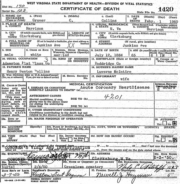 Jul-28-2018Husband: Grover C. Collins Born: Jul-12-1884 in Doddridge Co, WV 1,2 Died: Feb- 1-1950 in Clarksburg, Harrison Co, WV 1 Buried: in Greenlawn Masonic Cemetery, Clarksburg, Harrison Co, WV 1,3 Resided: in Clarksburg, Harrison Co, WV 1 Census: 1930 in Coal District, Harrison Co, WV Occupation: glass worker 4,1 Resided: 1905 in Gilmer Co, WV 2 Father: Henry Benton Collins (1845 - 1913) Mother: Emily Laverna McIntyre (1851 - 1919)