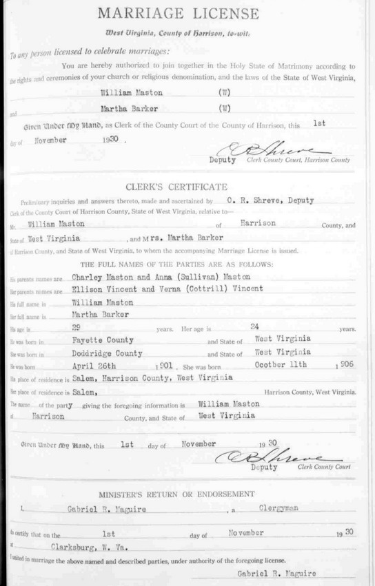 Jul-28-2018Husband: William Maston Born: Apr-26-1901 in Fayette Co, WV 1,2 Died: Apr- -1953 2 Resided: 1930 in Salem, WV 1 Father: Charles E. Maston (1862 - ) Mother: Nancy Ann Sullivan (1877 - )