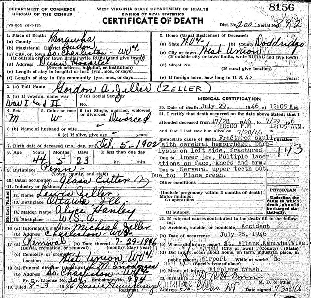 Jul-28-2018Husband: Gordon Alfonso Zeller Also known as: Gordan A. Zeller 1,2 Born: Feb- -1899 in Pennsylvania 3 Died: Jul-29-1946 in South Charleston, Kanawha Co, WV 4 Buried: in Blockhouse Hill Cemetery (Catholic section), West Union, Doddridge Co, WV 4,5 Resided: in West Union, Doddridge Co, WV 6,4 Resided: 1942 in Pennsylvania 7 Census: 1940 in Charleston, Kanawha Co, WV Census: 1920 in West Union, Doddridge Co, WV (see note 1) Resided: Sep 1918 in West Union, Doddridge Co, WV 8 Census: 1910 in Coudersport, Potter Co, PA Census: 1900 in Smethport, McKean Co, PA Occupation: glass cutter 4,9 Education: West Union H.S. (1916, Orator at commencement exercise) 10 Military: Nov-24-1942 - May- 6-1943 Pvt, HSC, 351 Engr Regt (GS), Camp White, Oregon WW II 7,11,12,4 Father: Lewis Zeller (1872 - 1956) Mother: Alice Hanley (1876 - 1941) Other spouse 1