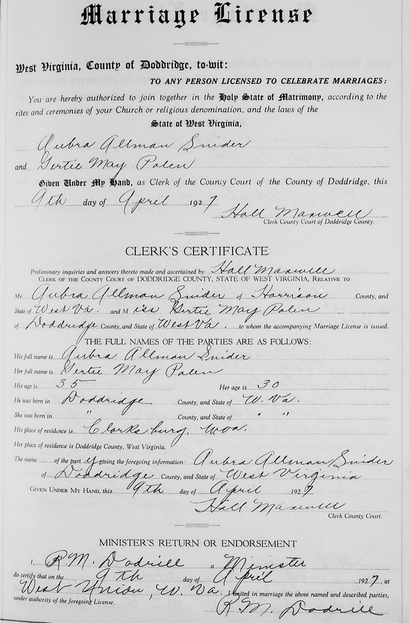 Sources: (1) Obituary. (2) Social Security Death Index. (3) 1900 Census, Doddridge County, WV (New Milton District) (4) Harrison County Marriage Records, Clarksburg, WV. (5) Gilmer County Marriage Records, Glenville, WV. (6) Doddridge County Marriage Records, West Union, WV. (7) 1930 Census, Harrison County, WV. (8) 1920 Census, Harrison County, WV. (9) Gilmer County Marriage Records, Glenville, WV, Identified as Aubra Snider, single, 23, b. Doddridge Co, res. Gilmer Co; and Bessie Alltop, single, 17, b. & res. in Gilmer Co. Married Feb 28 1915 in Gilmer County, officiated by C. L. James. MR p. 97, Line 16 : http://www.wvculture.org/vrr/va_view.aspx?Id=6997&Type=Marriage. (10) Findagrave.com. (11) West Virginia Deaths Index, 1853-1973 [database on-line], Ancestry.com. (12) Cemeteries of Coal District, Harrison County, WV, Harrison County Genealogical Society, Clarksburg, WV (1990) (13) Obituary of mother. (14) Upshur County Marriage Records, Buckhannon, WV. Event Notes Note (1) Birthplace given obituary as Gilmer County, but all three of his marriage records state Doddridge County. Note (2) Birth date given in 1900 Census as Aug 1898.Name Index