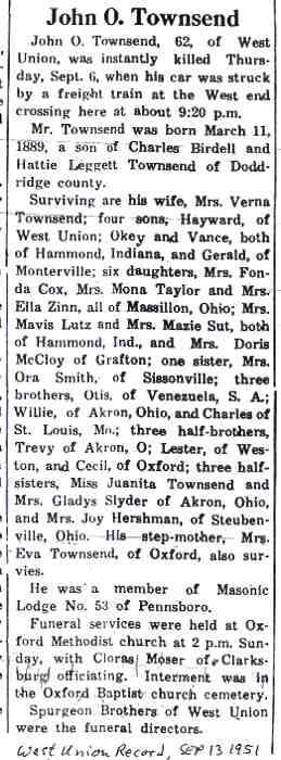 Jul-28-2018Husband: Johnnie Ottman Townsend 1,2 Also known as: Johnie Townsen 3 Born: Mar-11-1889 in Doddridge Co, WV 1,4,2 Died: Sep- 6-1951 in West Union, Doddridge Co, WV 1,2 Buried: in Oxford Baptist Church Cemetery, Doddridge Co, WV 1,5,2 Cause of death: struck by B & O Railroad train 2 Resided: in West Union, Doddridge Co, WV 2,6 Census: 1920, 1930 in Union District, Ritchie Co, WV Resided: 1910 in Ritchie Co, WV 4 Census: 1900 in New Milton, Doddridge Co, WV 7 Occupation: carpenter 2 Father: Charles Birdwell "Bert" Townsen (1863 - 1947) Mother: Harriet "Hattie" Leggett (1866 - 1903) Notes