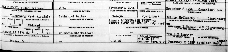 Wife: Susan Frances Lattea Also known as: Francis Lattea 4 Married: May-29-1892 in Lewis Co, WV 2 Born: Aug-13-1874 in Lewis Co, WV 3,1,2,5,6 Died: Nov- 4-1956 in Clarksburg, Harrison Co, WV 7 Buried: in Greenlawn Masonic Cemetery, Clarksburg, Harrison Co, WV 7 Resided: 1936 in Clarksburg, Harrison Co, WV 4 Resided: 1921 in Harrison Co, WV 6 Census: 1920 in Clarksburg, Harrison Co, WV Census: 1910 in Lincoln Co, WV Resided: 1904 in Calhoun Co, WV 5 Resided: 1892 in Lewis Co, WV 2 Father: Nathaniel Cathern Lattea (1847 - 1938) Mother: Columbia Serena Shackelford (1853 - 1936) Other spouse 2 Other spouse 3 Notes