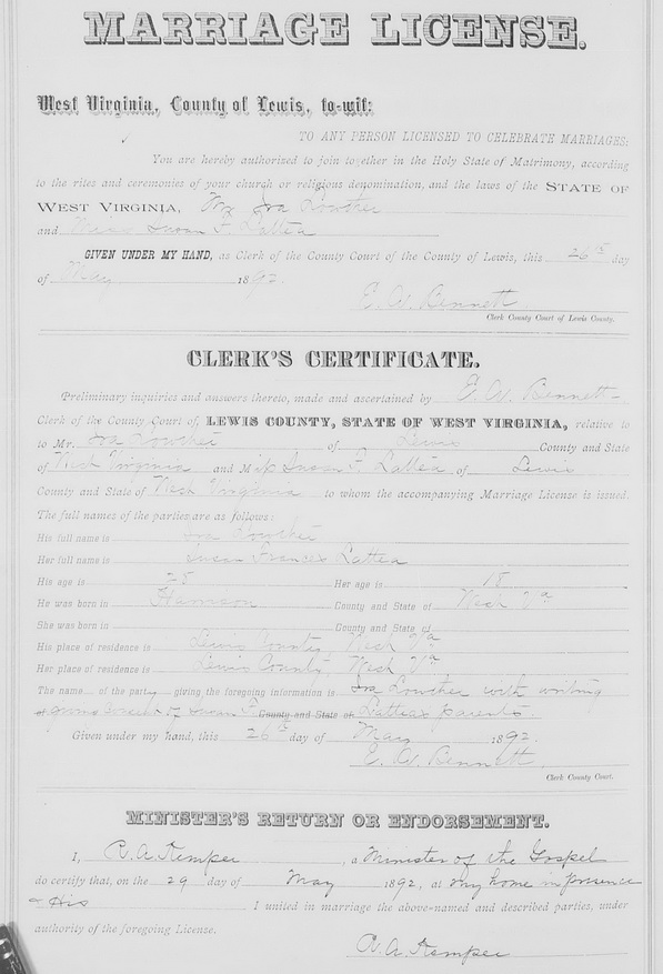 Sources: (1) 1900 Census, Lewis County, WV. (2) Lewis County Marriage Records, Weston, WV. (3) Lewis County Death Records, Weston, WV. (4) Obituary of mother. (5) Calhoun County Marriage Records, Grantsville, WV. (6) Harrison County Marriage Records, Clarksburg, WV. (7) Harrison County Death Records, Clarksburg, WV. (8) WV State Dept of Health, Div of Vital Statistics, Death Certificate (http://www.wvculture.org/vrr/va_dcsearch.aspx) (9) Death record of wife. (10) 1920 Census, Harrison County, WV.Name Index