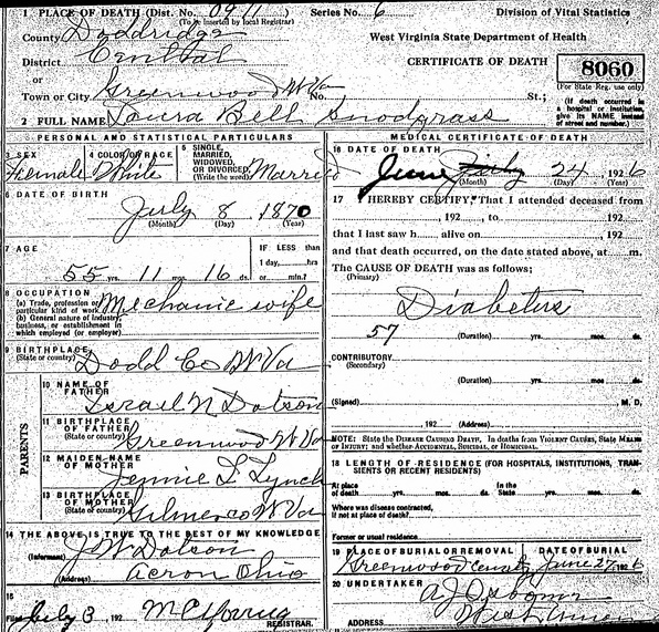 Wife: Laura Belle Dotson Married: Jul-25-1894 in Fairmont, Marion Co, WV 1 Born: Jul- 8-1870 in Doddridge Co, WV 2 Died: Jun-24-1926 at Greenwood, Doddridge Co, WV 2 Buried: in Greenwood Cemetery, Greenwood, Doddridge Co, WV 2 Resided: 1914, 1916 in Greenwood, Doddridge Co, WV 3,4 Census: 1910 in Eagle District, Harrison Co, WV Census: 1900 in Tenmile District, Harrison Co, WV Resided: 1894, 1896 in Marion Co, WV 1 Father: Israel N. Dotson (1845 - 1916) Mother: Louisa Jane Lynch (1845 - 1914) Other spouse 2
