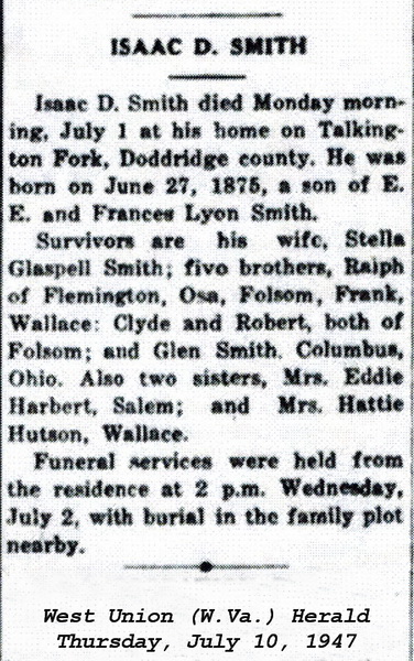 Jul-28-2018Husband: Isaac Davisson Smith Born: Jun-27-1875 in Harrison Co, WV 1,2,3 Died: Jun-30-1947 at Talkington Fork (Center Point), Doddridge Co, WV 1,4 (see note 1) Buried: family cemetery 1 (see note 2) Resided: at Talkington Fork (Center Point), Doddridge Co, WV 2 Census: 1900, 10, 20, 30, 40 in McClellan District, Doddridge Co, WV (see note 3) Resided: 1918 in Folsom, Wetzel Co, WV 5 Resided: 1903 in Doddridge Co, WV 6 Occupation: farmer 1,7 Father: Elias E. Smith (1837 - ) Mother: Eleanor Frances Lyons (1842 - 1908)