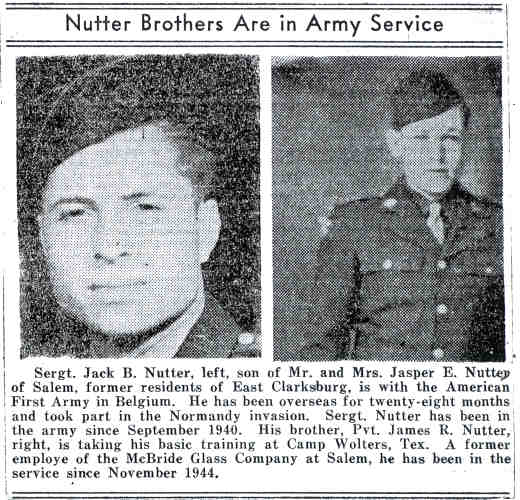 F Child 2: Bernice Leone Nutter Born: Jun-10-1918 in Clarksburg, Harrison Co, WV 9,12,10 Died: Sep-19-1962 in Salem, Harrison Co, WV 12,10 Buried: in IOOF Cemetery, Salem, Harrison Co, WV 4,12 Cause of death: cerebral hemorrhage 12 Resided: in Salem, Harrison Co, WV 12 Census: 1930, 1940 in Clarksburg, Harrison Co, WV Occupation: waitress 12 Husband: Jesse Eugene "Curley" Gain b. Nov-17-1922 d. Mar-21-1991M Child 3: Jack Bernard Nutter Born: Jun-25-1921 8 Died: Aug-29-1979 Buried: in Baltimore National Cemetery, Baltimore, MD 13 Resided: in Baltimore, MD 11 Census: 1930, 1940 in Clarksburg, Harrison Co, WV Military: (enlisted 10/1/1940) U.S. Army, World War II, Europe (Normandy invasion) 14,15