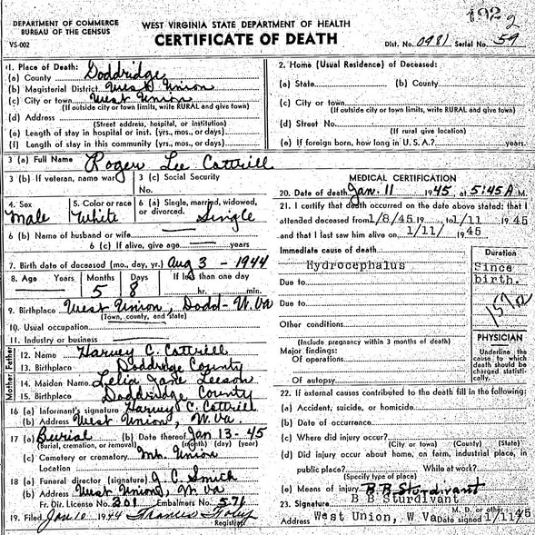 Sources: (1) Marriage record of daughter. (2) Obituary. (3) Social Security Death Index. (4) 1920 Census, Doddridge County, WV (Cove District). (5) Obituary - United Hospital Center. (6) Obituary of son. (7) Obituary of stepfather. (8) WV State Dept of Health, Div of Vital Statistics, Death Certificate (http://www.wvculture.org/vrr/va_dcsearch.aspx) (9) WV State Dept of Health, Div of Vital Statistics, Death Certificate (http://www.wvculture.org/vrr/va_dcsearch.aspx). Cause of death: hydrocephalus. (10) Ritchie County WV Marriages 1945-1970, Wes Cochran, 2515 10th Ave, Parkersburg WV 26101 (Dec 2003) (11) Obituary of father.Name Index