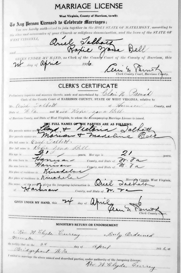 Wife: Roxie Zona Bell Born: May-21-1904 in Harrison Co, WV 3,8 Died: Oct- 2-1958 3 Buried: in Pleasant Hill UM Cemetery, near Kincheloe, Harrison Co, WV 4 Census: 1930 in Union District, Harrison Co, WV Resided: 1926 in Kincheloe (Jane Lew), Harrison Co, WV 8 Father: Marion Bell (1848 - 1922) Mother: Madalena C. Ash (1861 - 1925) Other spouse 1