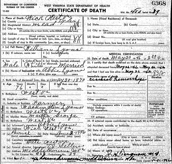 Jul-28-2018Husband: William Lyons Born: May-30-1870 in Tyler Co, WV 1,2,3,4,5 Died: May-30-1946 in Wick, Tyler Co, WV 1,3 Buried: in Lyons Cemetery, Dale, Tyler Co, WV 1,6 Census: 1940 in Meade District, Tyler Co, WV Census: 1930 in McElroy Creek, McClellan District, Doddridge Co, WV Census: 1920 in Grant District, Doddridge Co, WV Resided: 1914 in Tyler Co, WV 2 Census: 1900 in McElroy District, Tyler Co, WV Occupation: farmer 1,7,8 Father: George Washington Lyons (1838 - 1913) Mother: Martha J. George (1840 - 1923) Other spouse 2