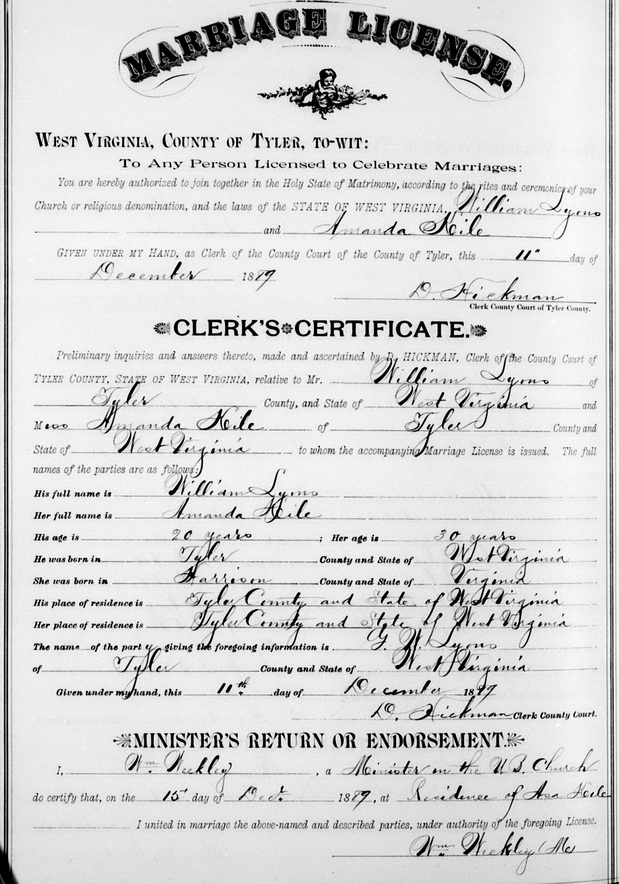 Sources: (1) WV State Dept of Health, Div of Vital Statistics, Death Certificate (http://www.wvculture.org/vrr/va_dcsearch.aspx) (2) Wirt County Marriage Records, Elizabeth, WV. (3) Headstone (year only) (4) Tyler County Marriage Records, Middlebourne, WV. (5) 1900 Census, Tyler County, WV. (6) Gary Patterson, Tyler County West Virginia Cemeteries (website), http://myplace.frontier.com/~garyepatterson/cemidx.htm. (7) 1930 Census, Doddridge County, WV (McClellan District) (8) 1920 Census, Doddridge County, WV (Grant District). (9) Death record of daughter. (10) Headstone. (11) 1860 Census, Tyler County, (W)VA. (12) Obituary of husband. (13) 1940 Census, Doddridge County, WV (Central District) (14) 1930 Census, Tyler County, WV. Event Notes Note (1) Informant: G. W. Lyons. Wedding held at residence of Asa Kile. Note (2) Age 30 in 1889 marriage record would put birth in about 1859. But age 4 in 1860 Census put it in about 1856, one year older than sister Elizabeth. Birth date Mar 1857 given in 1900 Census conflicts with the 1860 Census and with the established birth date of sister Elizabeth. Birth date on headstone is Mar 7 1856.Name Index