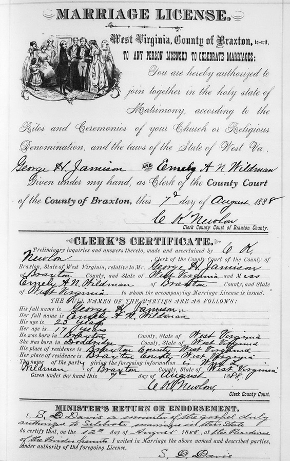 Wife: Emily A. Nettie Wildman Married: Aug-12-1888 in Braxton Co, WV 2