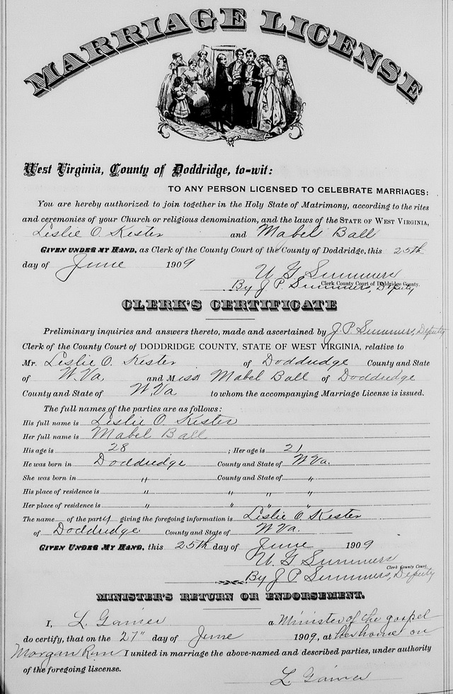 Sources: (1) Doddridge County Marriage Records, West Union, WV. (2) 1920 Census, Doddridge County, WV (Grant District). (3) Marriage record of daughter. (4) Doddridge County Marriage Records, West Union, WV, Identified as Leslie O. Kester, 28. b. & res. in Doddridge Co; and Mabel Ball, 21, b. & res. in Doddridge Co. Married June 27 1909 "at her home on Morgan Run.", MR p. 228 : www.wvculture.org/vrr/va_view.aspx?Id=11794622&Type=Marriage. (5) 1900 Census, Doddridge County, WV (Grant District) (6) Newspaper wedding announcement. (7) WV State Dept of Health, Div of Vital Statistics, Death Certificate (http://www.wvculture.org/vrr/va_dcsearch.aspx) (8) Social Security Death Index. (9) Lewis County Marriage Records, Weston, WV. (10) Social Security Death Index, Social Security card issued in West Virginia before 1951. (11) Death record of sister.Name Index