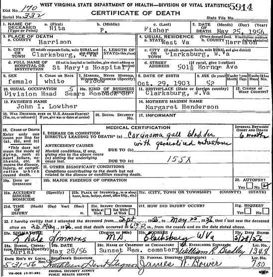 Wife: Rita P. Lowther Also known as: Reta P. Lowther 2 Married: Mar-26-1921 in Flemington, Taylor Co, WV 2 Born: Oct-29-1903 in Clarksburg, Harrison Co, WV 1,2 Died: May-25-1956 in Clarksburg, Harrison Co, WV 1 Buried: in Sunset Memorial Park, Clarksburg, Harrison Co, WV 1 Resided: in Clarksburg, Harrison Co, WV 1 Census: 1910 in Clark District, Harrison Co, WV Occupation: division head, Sears Roebuck Co. 1 Father: John Irwin Lowther (1859 - 1924) Mother: Margaret Ann Henderson (1869 - 1924)