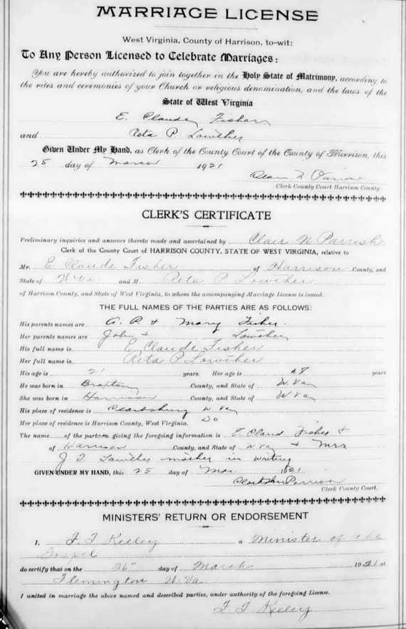 Jul-28-2018Husband: E. Claude Fisher Born: Oct-21-1900 in Braxton Co, WV 1,2 Died: May-27-1947 in Clarksburg, Harrison Co, WV 1 Buried: in Sunset Memorial Park, Clarksburg, Harrison Co, WV 1 Resided: in Clarksburg, Harrison Co, WV 1,2 Occupation: American Railway Express Co. (25 yrs) 1 Father: Adam Perry Fisher (1858 - 1918) Mother: Mary L. Brown (1866 - )