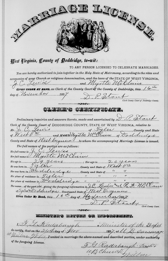 Wife: Laura Myrtle McClain 9,10 Also known as: Myrtle Laura McClain Married: Nov-24-1897 at Wilbur, Tyler Co, WV 3 Born: Aug-29-1877 in Smithburg, Doddridge Co, WV 11,2,3,10 (see note 3) Died: Aug-19-1969 in Clarksburg, Harrison Co, WV 12,2 Buried: in Masonic Memorial Park Cemetery, Crystal Lake (West Union), WV 6,12,13 Census: 1910, 20, 30, 40 in Central District, Doddridge Co, WV Resided: 1916 in Central Station, Doddridge Co, WV 14 Census: 1900 in Centerville District, Tyler Co, WV Father: Robert Alexander "Eck" McClain (1856 - 1952) Mother: Aloyra A. Furby (1856 - )