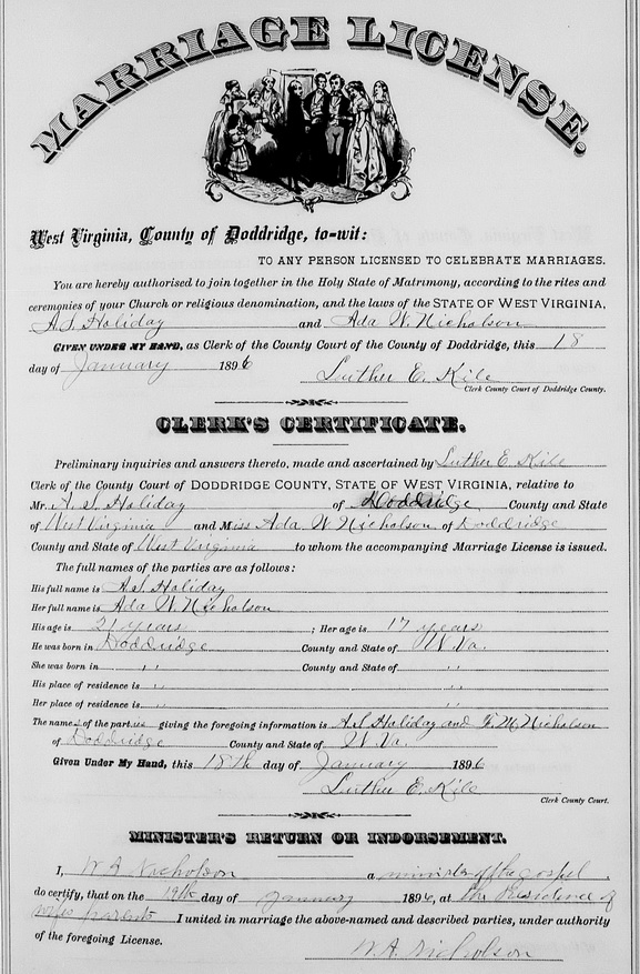 Sources: (1) Death record of son. (2) Marriage record of daughter. (3) WV State Dept of Health, Div of Vital Statistics, Death Certificate (http://www.wvculture.org/vrr/va_dcsearch.aspx) (4) 1900 Census, Doddridge County, WV (New Milton District) (5) Doddridge County Marriage Records, West Union, WV. (6) Harrison County Death Records, Clarksburg, WV. (7) 1910 Census, Doddridge County, WV (Greenbrier District) (8) 1920 Census, Harrison County, WV. (9) Marriage record of son. (10) Harrison County Marriage Records, Clarksburg, WV, http://www.wvculture.org/vrr/va_view.aspx?Id=28900&Type=Marriage. (11) Marion County Marriage Records, Fairmont, WV, http://www.wvculture.org/vrr/va_view.aspx?Id=12542792&Type=Marriage. (12) West Virginia Deaths Index, 1853-1973 [database on-line], Ancestry.com. (13) Findagrave.com. (14) Record of wife's remarriage. (15) Harrison County Marriage Records, Clarksburg, WV. (16) West Virginia Births Index, 1853-1969 [database on-line], Ancestry.com. (17) West Virginia Marriages Index, 1785-1971 [database on-line], Ancestry.com. Event Notes Note (1) Listed as daughter Alda G. Straley, 23, married, in household of parents. Her daughter Iris was present, but her husband was not. The enumeration date of this census was January 1920. The record of her May 1920 remarriage, in which she was identified as Alda Gertrude Holliday, gave her marital status as divorced. Note (2) Birth date given as Dec 26 1900 in marriage record, but as Dec 26 1899 in death record. He was in the 1900 Census, age 6 months, birth date Dec 1899.Name Index