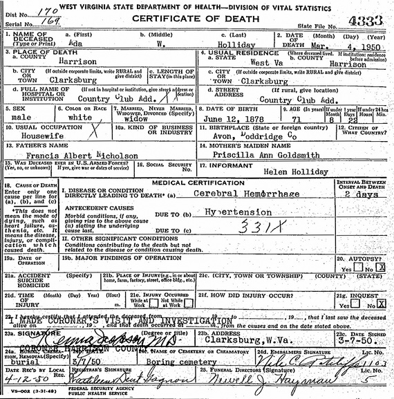 Wife: Ada W. Nicholson 9,1 Married: Jan-19-1896 in Doddridge Co, WV 5 Born: Jun-12-1878 at Avon, Doddridge Co, WV 3,5 Died: Mar- 4-1950 in Clarksburg, Harrison Co, WV 3 Buried: in Boring Cemetery (aka Bethlehem Church), Davisson Run, Clarksburg, Harrison Co, WV 3 Census: 1920 in Davisson Run (Clarksburg), Harrison Co, WV Census: 1910 in Greenbrier District, Doddridge Co, WV Census: 1880, 1900 in New Milton District, Doddridge Co, WV Father: Francis Marion Albert Nicholson (1852 - ) Mother: Priscilla Ann "Sally" Goldsmith (1846 - 1908)