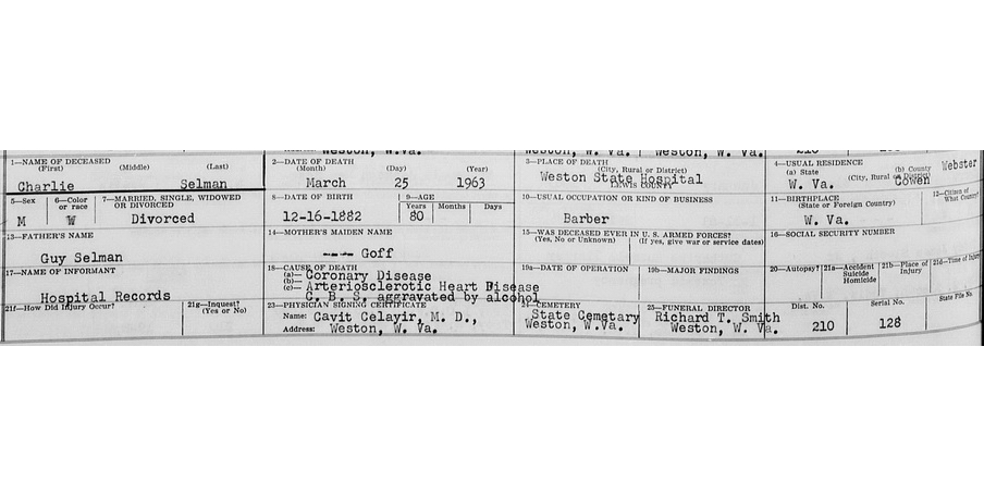 Jul-28-2018Husband: Charles Brooks Selman Also known as: Charley B. Selman 1 Born: Dec-16-1882 in Webster Co, WV 2,3,4 Died: Mar-25-1963 in Weston, Lewis Co, WV 2 Buried: State Cemetery in Weston, Lewis Co, WV 2 Resided: in Cowen, Webster Co, WV 2 Resided: 1926 in Clarksburg, Harrison Co, WV 4 Census: 1900 in Webster Co, WV Occupation: barber 2 Father: Lorenzo Dow Selman (1861 - 1919) Mother: Sarah Margaret Goff (1862 - 1933) Other spouse 1