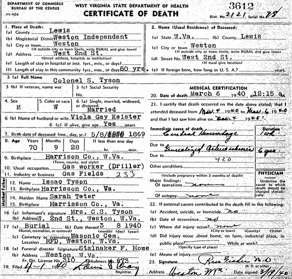 Jul-28-2018Husband: Colonel S. Tyson Born: May- 8-1869 in Harrison Co, WV 1 Died: Mar- 6-1940 in Weston, Lewis Co, WV 1 Buried: in Weston Masonic Cemetery, Weston, Lewis Co, WV 1 Resided: in Weston, Lewis Co, WV 1 Census: 1910 in Troy District, Gilmer Co, WV Occupation: gas worker (driller) 1 Father: Isaac Tyson (1837 - 1908) Mother: Sarah A. Teter (1844 - 1909)