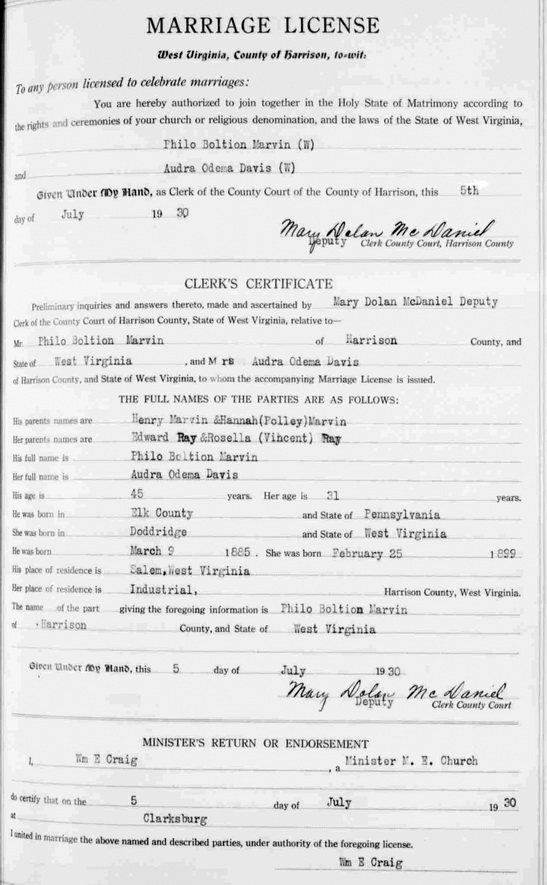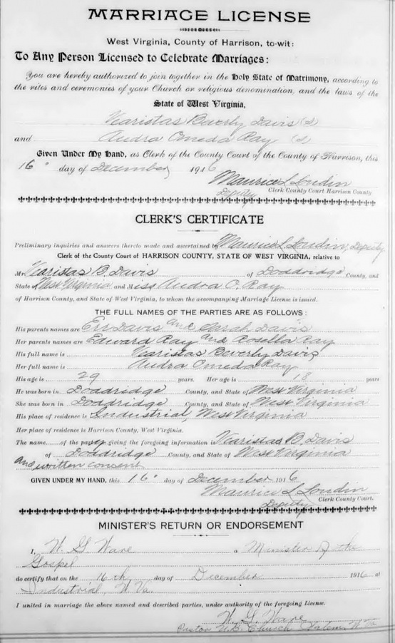 Wife: Audra Odema "Audy" Ray 3 3 Also known as: Audra Omeda Ray 2 Married: Dec-16-1916 in Industrial, Harrison Co, WV 2 Born: Feb-25-1899 in Doddridge Co, WV 4,2 Died: Nov-20-1990 5 Resided: 1930 in Industrial, Harrison Co, WV 2 Resided: 1916 in Harrison Co, WV 2 Census: 1910 in Sardis District, Harrison Co, WV Father: James Edward Ray (1871 - 1908) Mother: Rosella Elmira Vincent (1874 - 1945) Other spouse 2 Notes