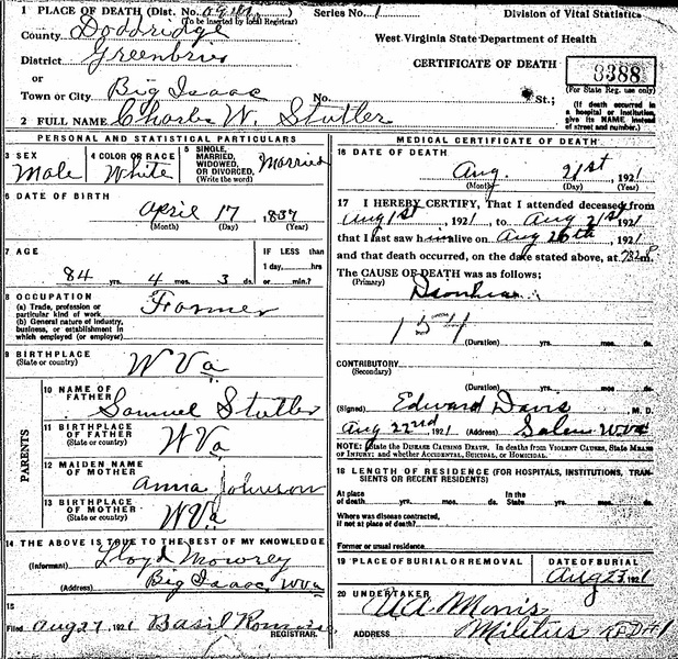 Jul-28-2018Husband: Charles W. Stutler Born: Apr-17-1837 in Lewis Co, (W)VA 1,2 Died: Aug-21-1921 at Big Isaac, Doddridge Co, WV 1 Buried: in Big Isaac Cemetery, Big Isaac, Doddridge Co, WV 3 Census: 1870, 1880 in New Milton District, Doddridge Co, WV Resided: 1861 in Doddridge Co, (W)VA 2 Occupation: farmer Military: Pvt, Co E, 3rd W.Va. Cavalry, Civil War 3 Father: Samuel Stutler