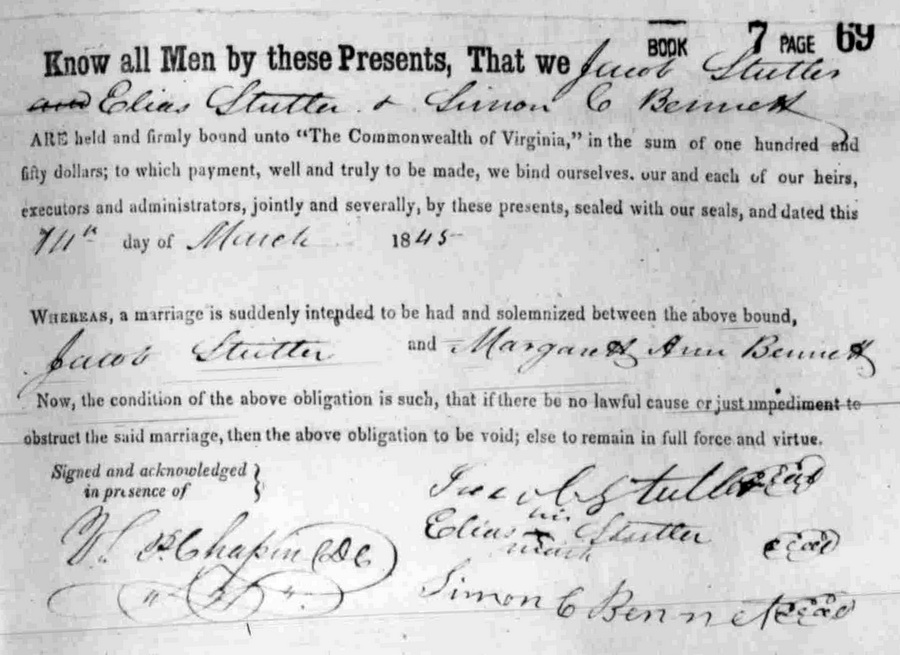Wife: Margaret Ann Bennett 4 Marriage Bond: Mar-14-1845 in Harrison Co, (W)VA 5 Married: Mar-20-1845 in Harrison Co, (W)VA 6,7 Born: Feb- 7-1829 in Harrison Co, (W)VA 3,2 Died: Jun-10-1904 in Harrison Co, WV 3 Buried: in Mt. Olive Cemetery, Jarvisville Rd, Tichenal, Harrison Co, WV 3 Census: 1880 in Union District, Harrison Co, WV Census: 1850, 1860 in Harrison Co, (W)VA Father: Simon C. Bennett (1796 - ) Mother: Mary C. Post (1801 - )