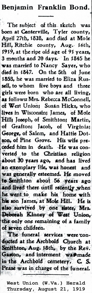 Jul-28-2018Husband: Benjamin Franklin "Frank" Bond Also known as: Frank Bond 1 Born: Apr-27-1828 at Centerville, Tyler Co, WV 2,3 Died: Aug-16-1919 at Mole Hill (now Mountain), Ritchie Co, WV 2 Buried: (unmarked) in Archbold Cemetery, Smithburg, Doddridge Co, WV 2 Resided: from abt 1863 in Smithburg, Doddridge Co, WV 2 Census: 1870, 80, 1900, 10 in West Union District, Doddridge Co, WV Census: 1860 in Doddridge Co, (W)VA Resided: 1855 in Doddridge Co, (W)VA Census: 1850 in Doddridge Co, (W)VA (see note 1) Occupation: 1860, 1870, 1880 blacksmith 4,5,6 Occupation: 1855 mechanic 7 Father: Barney B. Bond (1799 - 1868) Mother: Mary "Polly" Smith (1809 - 1883) Other spouse 1