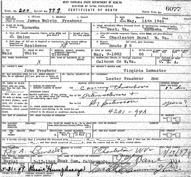 Jul-28-2018Husband: James Melvin Freshour Born: Mar- 9-1883 in Calhoun Co, WV 1,2 Died: May-14-1949 near Charleston, Kanawha Co, WV 1 Buried: unmarked grave in Isaac Husk Family Cem, Calhoun Co, WV 1 Resided: near Charleston, Kanawha Co, WV 1 Father: John Freshour (1844 - 1900) Mother: Virginia Jane Lemaster (1844 - )