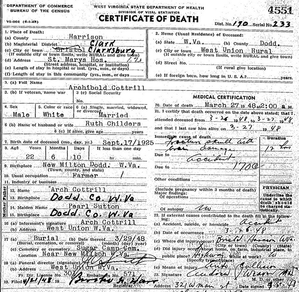 Jul-28-2018Husband: Archibold Cottrill Born: Sep-17-1925 in New Milton, Doddridge Co, WV 1 Died: Mar-27-1948 in Clarksburg, Harrison Co, WV 1 Buried: in Middle Island 7th Day Bapt Cem, Sugar Camp, New Milton, Doddridge Co WV 1 Cause of death: automobile accident, Bristol, WV, 3/26/1948 1 Resided: in Doddridge Co, WV 1,2 Census: 1930, 1940 in New Milton District, Doddridge Co, WV Occupation: farmer 1 Father: Arch Rochester Cottrill (1892 - 1965) Mother: Hannah Pearl Sutton (1892 - 1974)