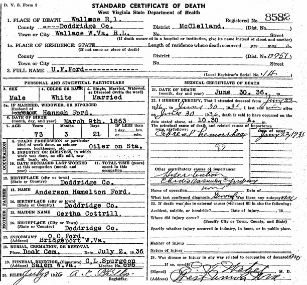 Jul-28-2018Husband: Useba Fernando Ford Also known as: Ucebous F. Ford 1 Born: Mar- 9-1863 in Doddridge Co, (W)VA 2,1 Died: Jun-30-1936 in McClellan District, Doddridge Co, WV 2 Buried: in Doak Cemetery, Big Flint, Doddridge Co, WV 2,3 Census: 1910, 1920, 1930 in McClellan District, Doddridge Co, WV (see note 1) Census: 1880 in West Union District, Doddridge Co, WV Census: 1870 in Grant District, Doddridge Co, WV Occupation: oiler on station 2 Occupation: 1910 sawyer (own sawmill) 4 Occupation: 1880 sawmill worker Father: Anderson Hamilton Ford (1839 - 1915) Mother: Jeretha Cottrill (1839 - 1917)