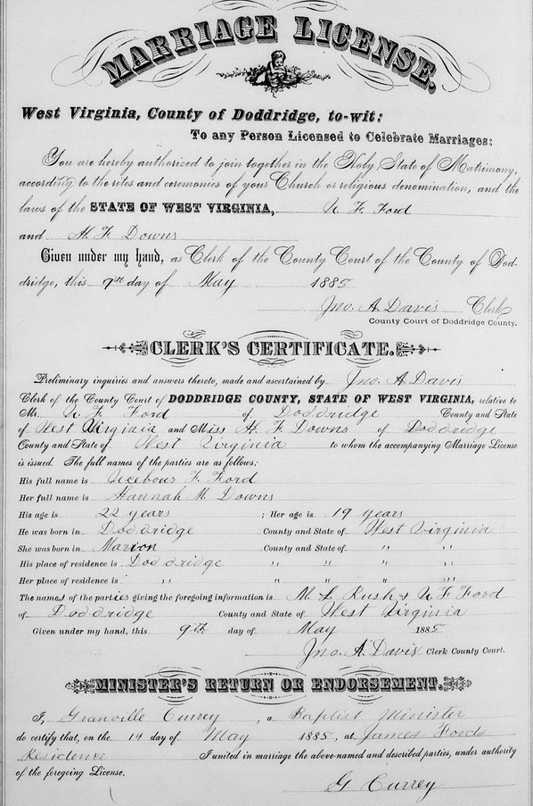 Wife: Hannah Myra Downs 5 Also known as: Hannah Marie Downs 2 Married: May-14-1885 in Doddridge Co, WV 1 Born: Mar-21-1866 in Marion Co, WV 2,1 Died: Apr- 4-1947 in McClellan District, Doddridge Co, WV 2,6 Buried: in Doak Cemetery, Big Flint, Doddridge Co, WV 2,3 Census: 1910, 20, 30, 40 in McClellan District, Doddridge Co, WV Resided: 1885 in Doddridge Co, WV 1 Census: 1880 in McClellan District, Doddridge Co, WV Father: Austin Downs (1845 - 1929) Mother: Sarah Ann Talkington (1843 - 1932) Notes