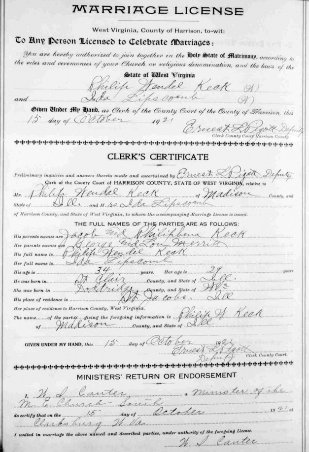 Wife: Ida Katherine Merritt Married: Oct-15-1921 in Clarksburg, Harrison Co, WV 1 Born: Aug- -1890 in Canton, Doddridge Co, WV 2,3,1,4 (see note 1) Died: Jun-11-1946 Resided: 1911, 1921 in Harrison Co, WV 1 Father: Crofton George Merritt (1862 - 1934) Mother: Laura Louise Rymer (1869 - 1942) Other spouse 1