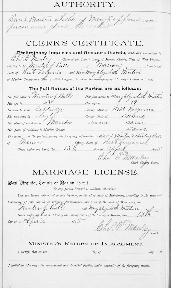 Wife: Mary Elizabeth Martin Married: 1895 in Marion Co, WV 2 Born: ca 1876 in Taylor Co, WV 2 Died: bef Feb 1905 3 Resided: 1895 in Marion Co, WV 2 Father: David Martin
