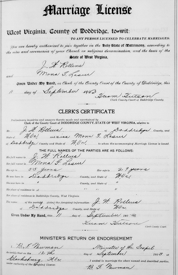 Wife: Mona Florence Lasur Married: Sep-12-1923 in Clarksburg, Harrison Co, WV 8,9 Born: Feb-10-1900 in Leopold, Doddridge Co, WV 10,2 (see note 2) Died: Dec- 8-1974 in Harrison Co, WV 11,2 Buried: in Masonic Memorial Park Cemetery, Crystal Lake (West Union), WV 4,5 Resided: 1946, 1947 at Central Station, Doddridge Co, WV 9,8 Census: 1930 in Central District, Doddridge Co, WV Census: 1920 in Cove District, Doddridge Co, WV Father: Andrew Jackson Lasure (1862 - 1947) Mother: Emily Elizabeth Spurgeon (1869 - 1953) Other spouse 2