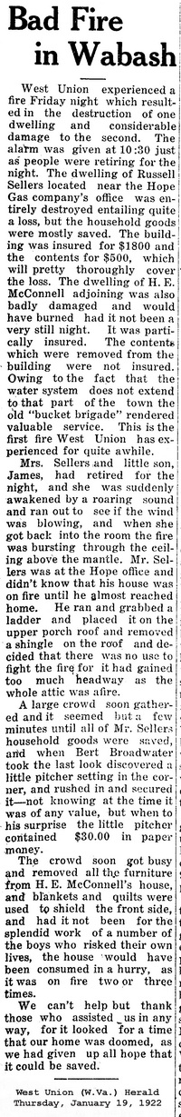 Jul-28-2018Husband: Harvey E. McConnell Born: Nov-12-1884 in Doddridge Co, WV 1,2,3 (see note 1) Died: May- 3-1942 in Parkersburg, Wood Co, WV 4 Buried: in Blockhouse Hill Cemetery (IOOF section), West Union, Doddridge Co, WV 1,5,6 Resided: in West Union, Doddridge Co, WV 1 Census: 1940 in Wabash (West Union), Doddridge Co, WV Census: 1900, 1920, 1930 in West Union, Doddridge Co, WV Occupation: printer, publisher of West Union Herald 1,7 Father: William W. McConnell (1848 - 1891) Mother: Rebecca Jane Bond (1859 - 1939)