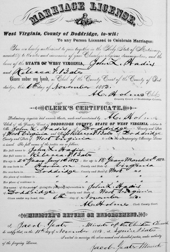 Sources: (1) Doddridge County Marriage Records, West Union, WV. (2) WV State Dept of Health, Div of Vital Statistics, Death Certificate (http://www.wvculture.org/vrr/va_dcsearch.aspx) (3) 1900 Census, Doddridge County, WV (McClellan District) (4) Findagrave.com. (5) 1910 Census, Doddridge County, WV (McClellan District). (6) Doddridge County Death Records, West Union, WV, Identified as R. F. Bates, 49, died Apr 27 1914, cause of death paralysis. Informant: C. H. Pigott, Assessor. The deceased's race, gender and marital status were left blank. Place of death is not clear, as the column labeled Place of Birth is frequently used instead on this ledger-style record to indicate Place of Death, for which no column was allocated. That column contains the entry Folsom, a community in Wetzel County near the Doddridge County border. It is noted that Rebecca F. (Bates) Haddox did not appear with her family in the 1920 Census, and her husband, John L. Haddox, was identified as a widower at the time of his Jan 1920 death. DR p. 65 : http://www.wvculture.org/vrr/va_view.aspx?Id=5044694&Type=Death. (7) Death record of father. (8) Doddridge County Marriage Records, West Union, WV, Identified as Ireland Haddox, 28, b. Doddridge Co, res. Harrison Co; and Alpha May Ash, 22, b. & res. in Doddridge Co. Married Oct 8 1913 "at the Waldo Hotel, Harrison Co, W.Va.", MR p. 214 : www.wvculture.org/vrr/va_view.aspx?Id=11795267&Type=Marriage. (9) WV State Dept of Health, Div of Vital Statistics, Death Certificate (http://www.wvculture.org/vrr/va_dcsearch.aspx), http://www.wvculture.org/vrr/va_view.aspx?Id=423360&Type=Death.Name Index