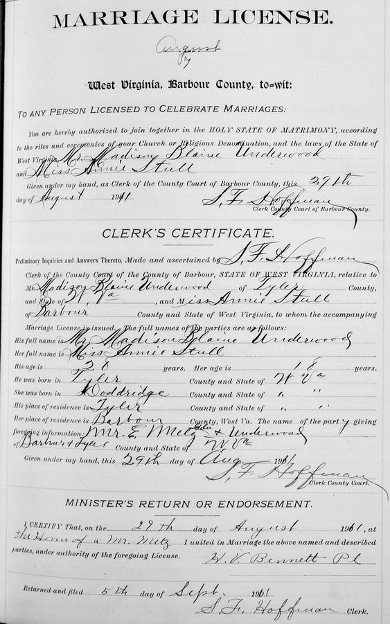 Wife: Annie Stull Also known as: Mannis Underwood 2 Married: Aug-29-1911 in Barbour Co, WV 5 Born: ca 1893 in Doddridge Co, WV 5 Resided: 1918 in Central Station, Doddridge Co, WV 4 Resided: 1911 in Barbour Co, WV 5 Father: Mother: